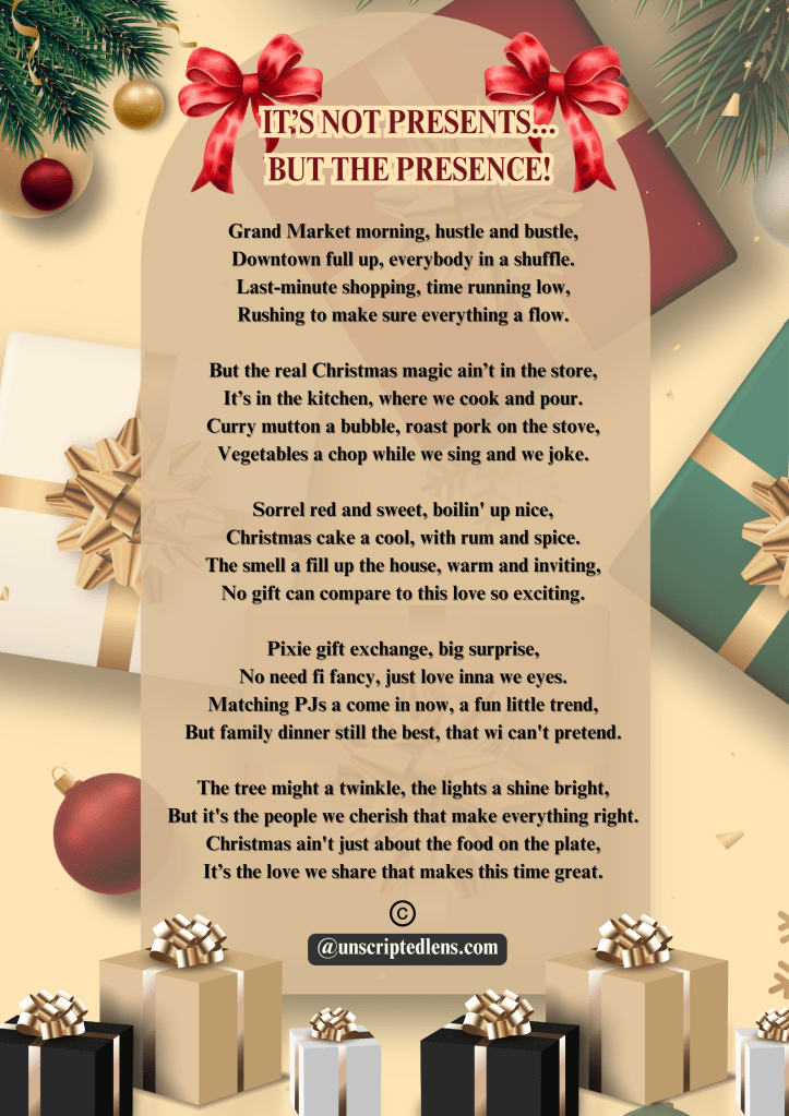 One of the things that always makes Christmas feel like Christmas is the food. Whether it’s the sorrel, the Christmas cake, or the pot roast pork, these dishes are more than just meals—they’re a part of our tradition. The smells, the flavors, and the shared meals bring us back to our roots and remind us of the comfort of family. Christmas is about more than just the food, but the food always reminds me of what really matters—home, love, and togetherness.